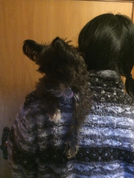 イチの特技は、肩乗り犬。