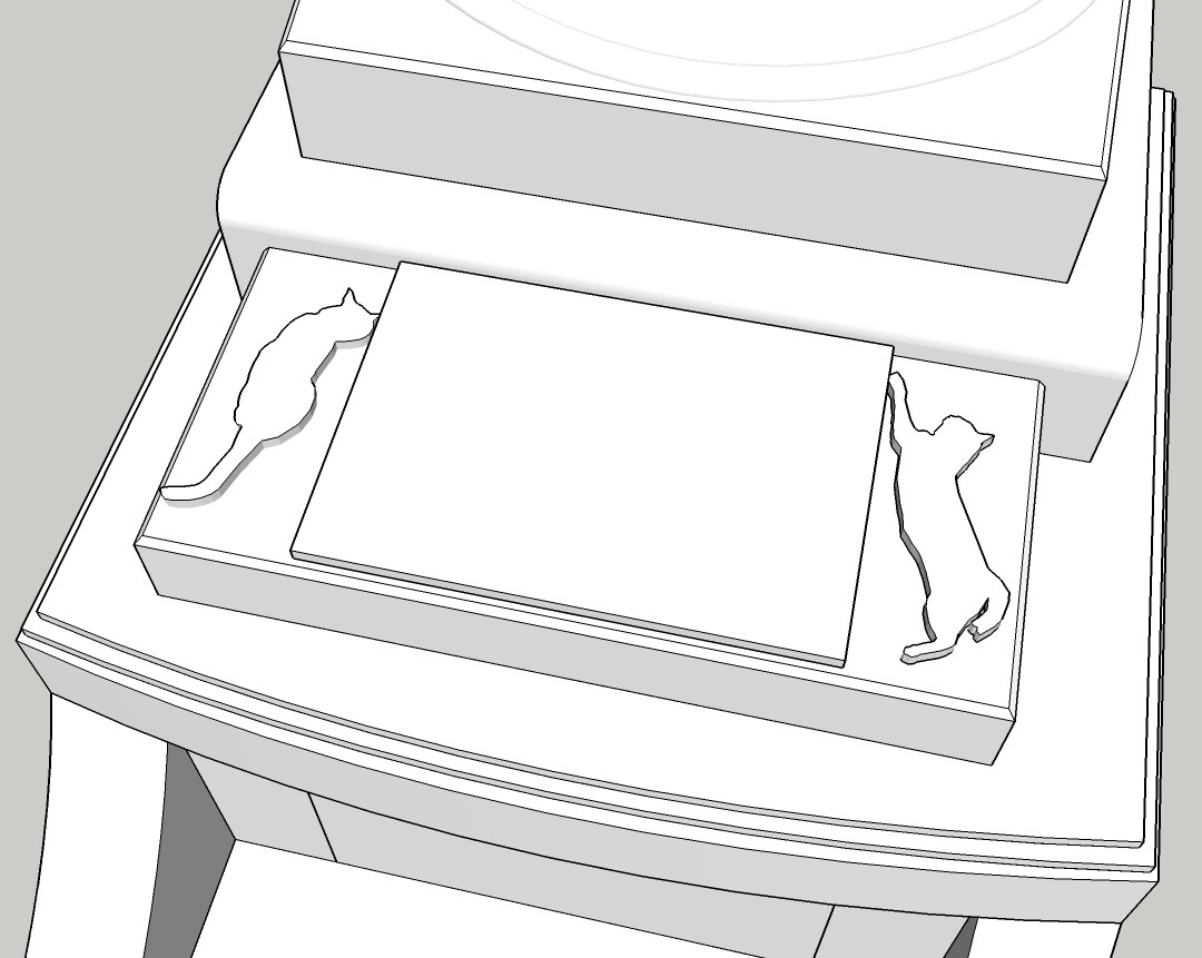 写真左:石材店に提出した、私のお墓デザイン。真ん中が献花台、両脇は今いるサビ猫姉妹のサーとビーをモデルにした猫のレリーフ(この子たちもいずれはここに入る)。上の段の楕円のプレートには私から捧げる文言を彫刻。