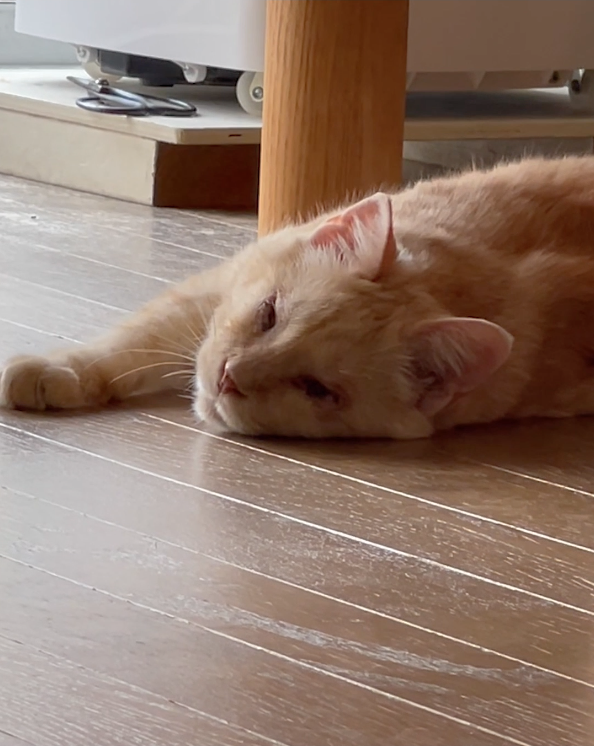 ニンゲンのベッド下の床で寝てる。