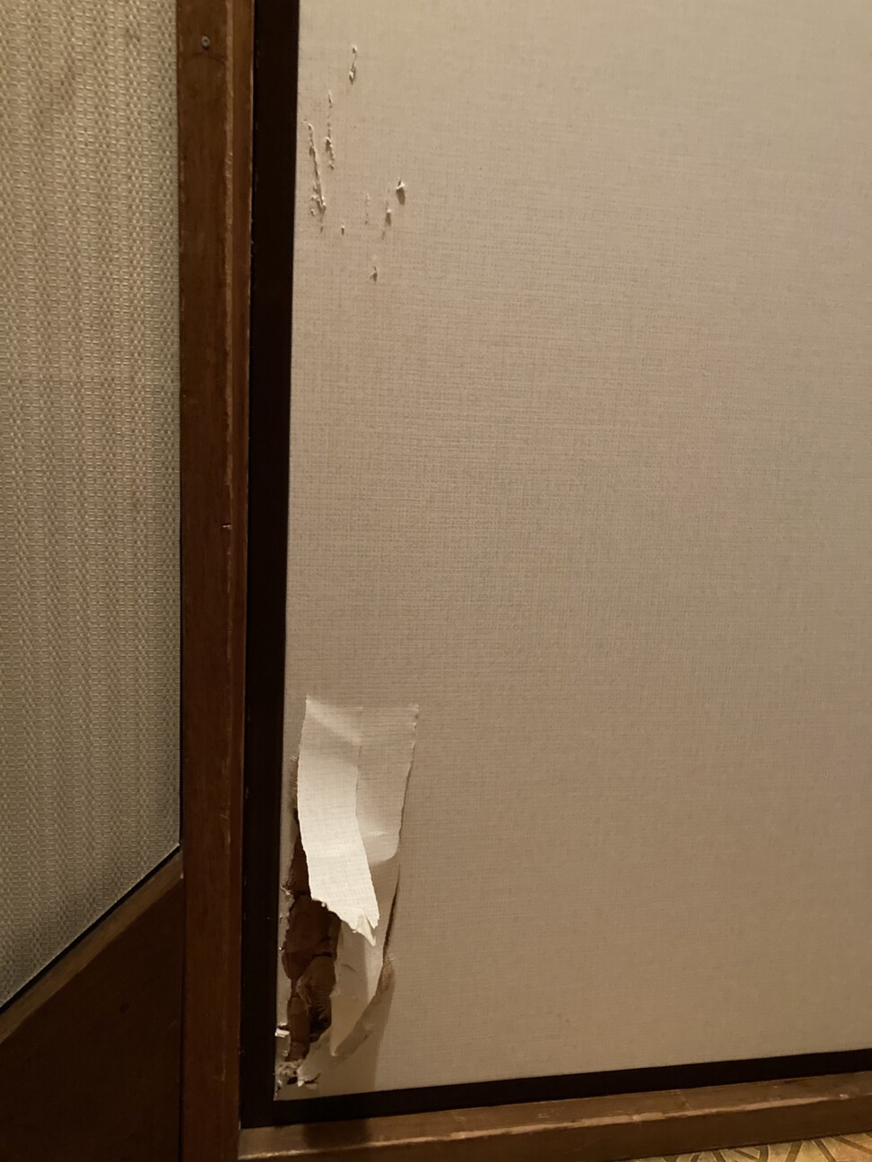 最近は襖を開けて部屋に入る事を覚えたので『突っ張り棒』にて簡単に開けられなくしたら写真の状況です。 怒るにも3匹いるので主犯は分からず泣き寝入り?です。