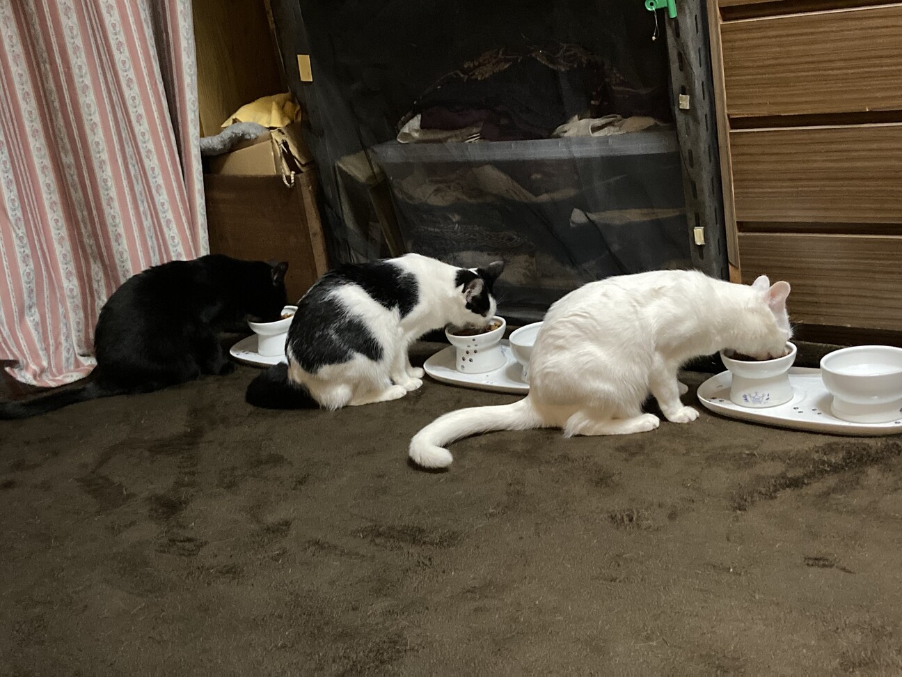 今日は朝から雨のため出かけずに家にいましたのでニャンズとの時間も多く取れました。 晩御飯は3匹仲良く。 今までは一日三食でしたが昼をあまり食べなくなり暫定的に朝晩だけにしています。 今日から新しいエサを混ぜて与えています。