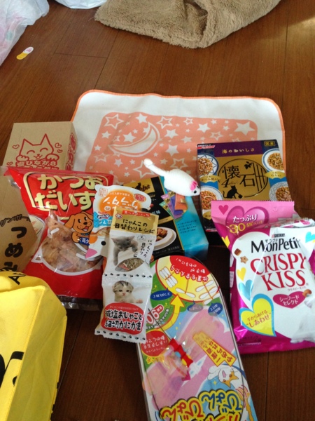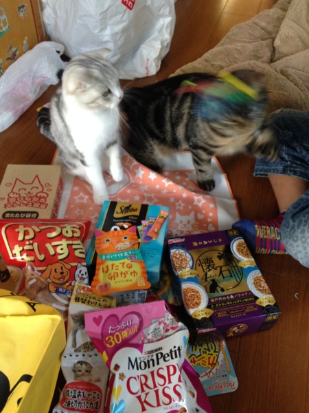 AEONPETで猫福袋をゲットしました。 2000円で写真の中身(^^♪ ドライフード2点、缶詰2点、おもちゃ3つに爪とぎ、おやつたくさん、猫用鰹節、極めつけ?はマタタビの染み付いた猫用マットです(^^) 単品では買わないけど、福袋に入っていたら何か嬉しい(^_^;) 早速おもちゃで遊び、おやつパリパリしていました。 ぴかちゃんとちょこちゃんがおもちゃを狙っています^._.^