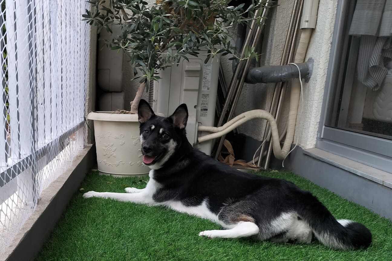 家が狭いので、少しでもモウモの居場所を作ろうと、ととがベランダに人工芝を敷きました。