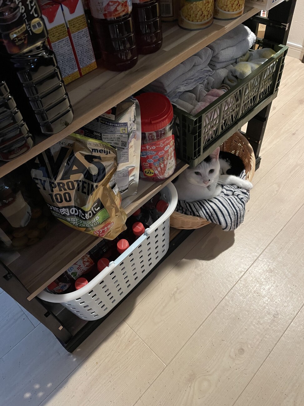 父ちゃんが作ってくれた母ちゃんの台所作業用の収納棚。すっかりまつりさんのお気に入りに。この下段ね。一番下はまつりさんに譲るよ(´∀`) 母ちゃん家事しながらまつりさんと話もできるしね。