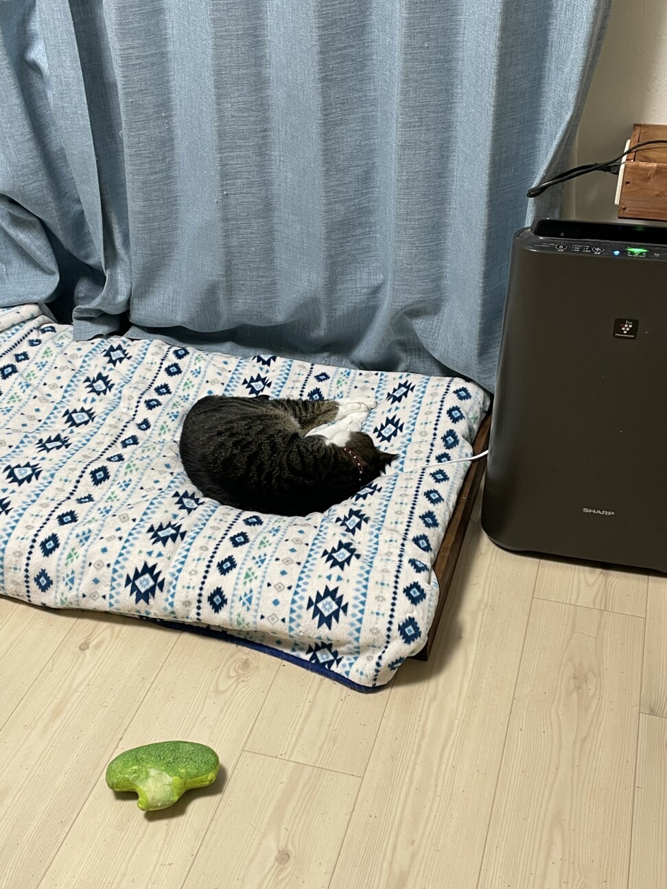 そう言えば、ユズコさんを介護中に使ってた人間の子供用の布団、処分すべきか悩んだけどとりあえずクリーニングして今もリビングに置いてるけど最近トムさんがちょくちょくここで昼寝してる。