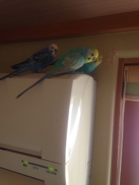 楽しい放鳥の時間がまもなく終わろうとしています。 今日は鳥籠を熱湯消毒したのでいつもより少し長めの放鳥でした。 なのに、気配を察してまたエアコンの上へ避難する…(`_´) しかし!こっちだって負けてはいません!! エアコンの上へチラシを置きます、するとエアコンの上へは登らないのです ( •̀∀•́ )b なんか、勝ったような気がする~(´∇`) これも今だけなんやろうなあ…「なんだ、紙やん。こわくないやん。鳥籠の下に敷いてあるやつやん。」ってわかったら効果なくなるような気がする…(^_^;)
