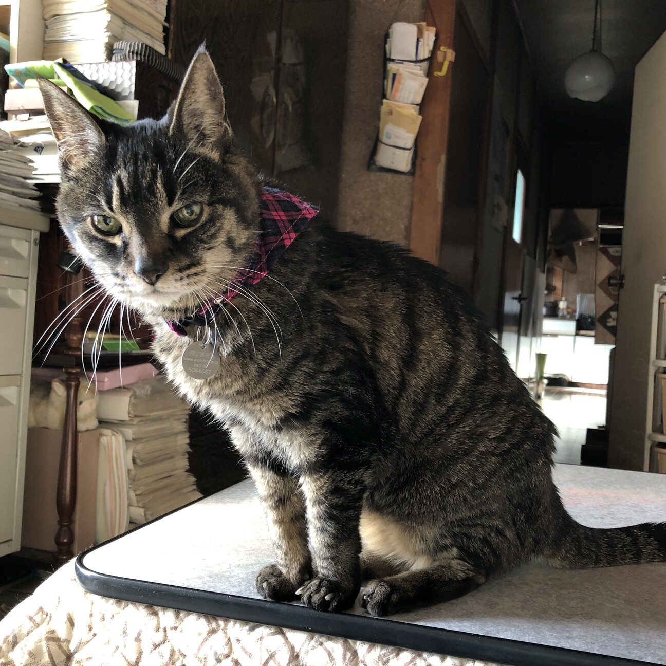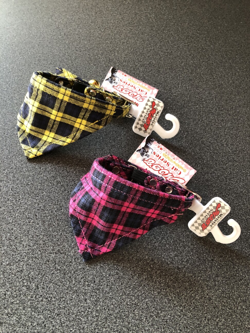 2023.12に首輪を新しくしました。バンダナが可愛いので、色と柄のみが変わっています。ふーちゃんは濃いめのピンク×チェック柄で、マイちゃんは黄色×チェック柄(鈴付き)です。どちらも迷子札をつけてます。