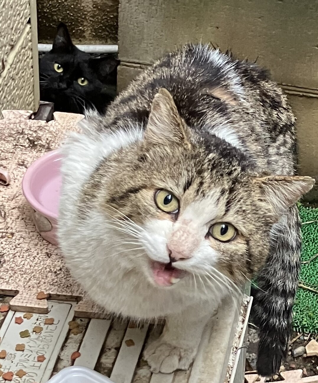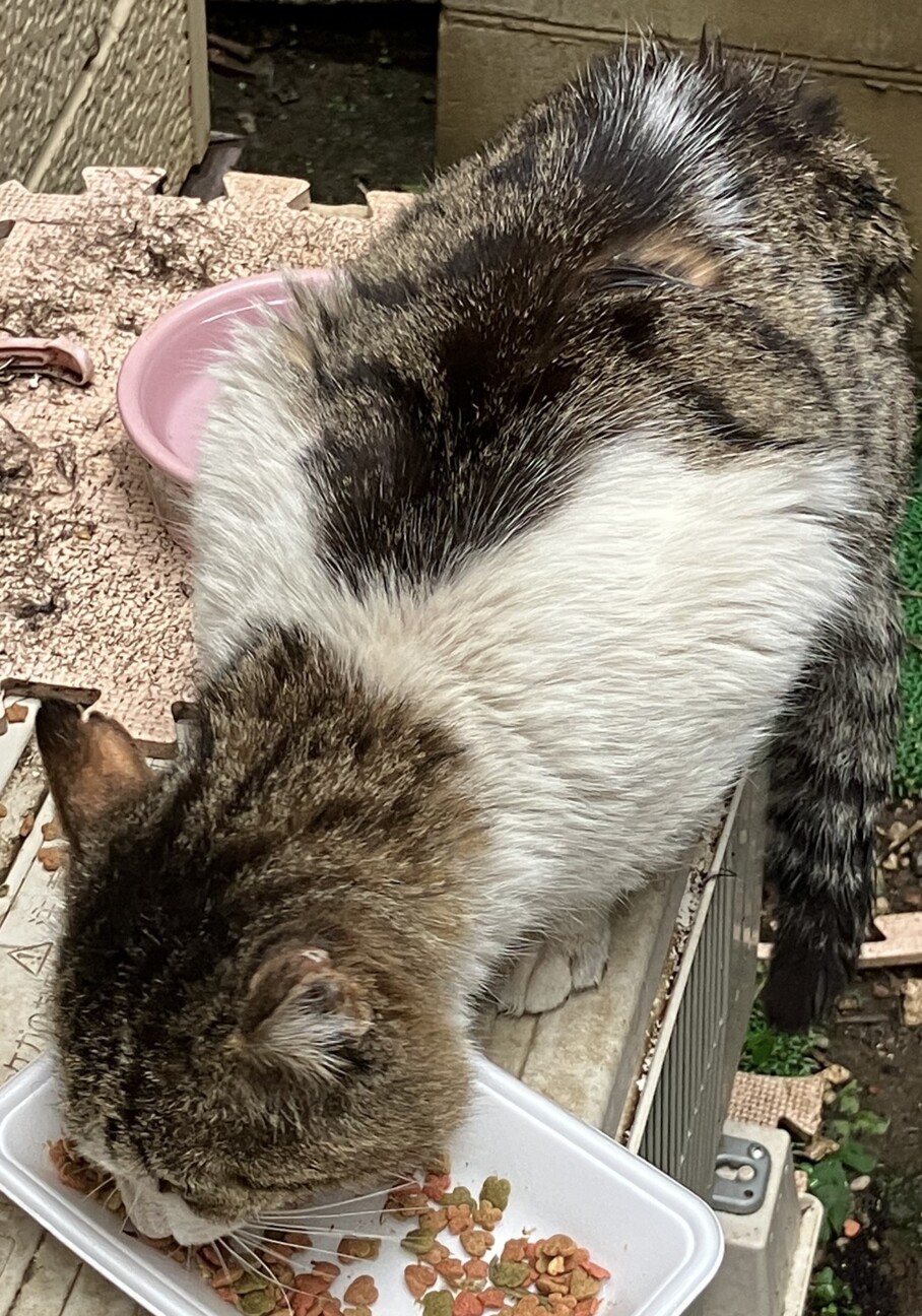 前回 喧嘩して皮が剥がれてしまったキジ白の子がジジに誘われご飯を食べに来ていました