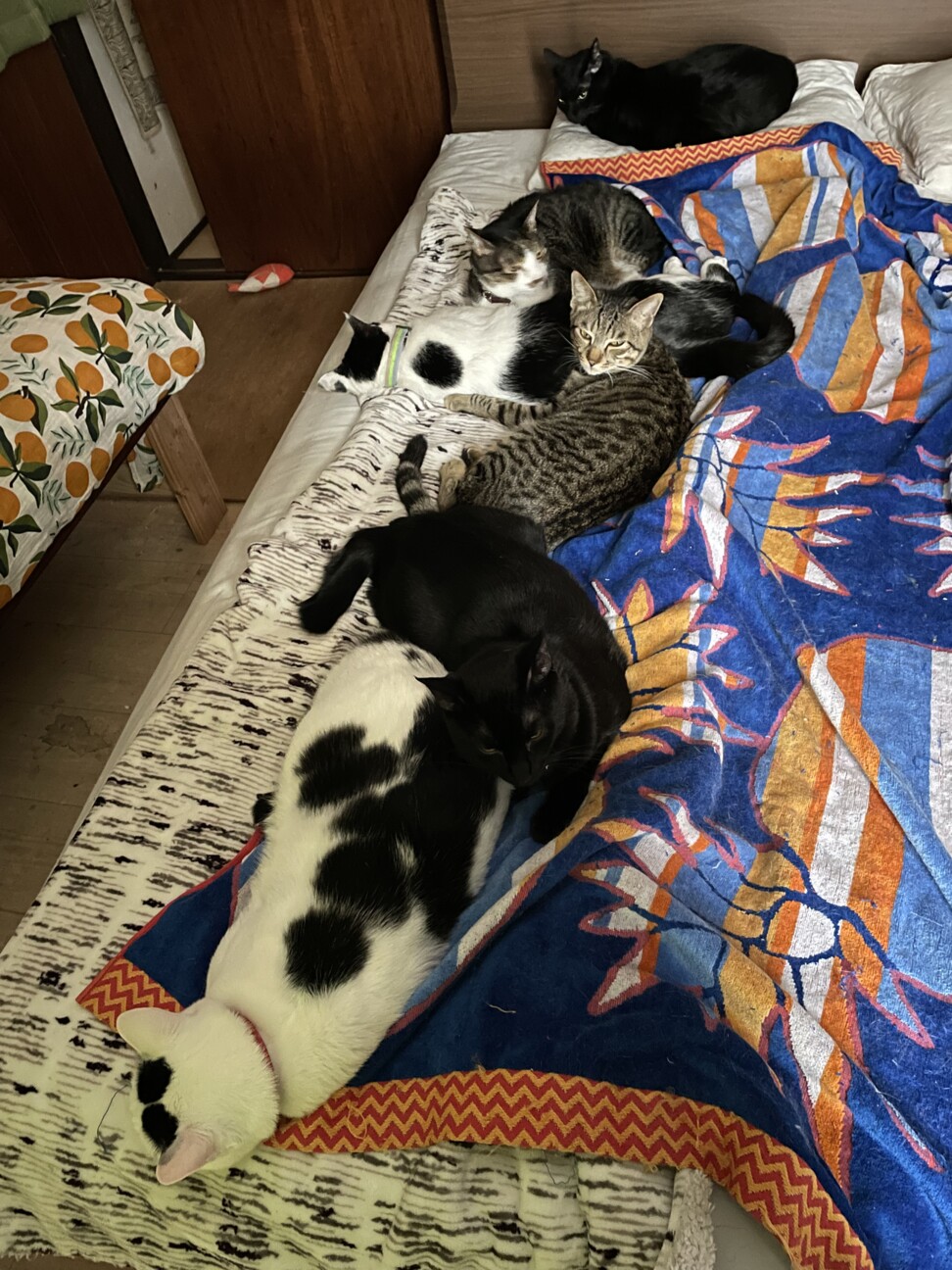 それにしても何やろ、このビーチ用バスタオル、サイズ感としてはセミシングルくらいあってものすごい大きいんです。価格は1600円くらいだったかな。みんなこれの上に確実に集まって寝るから面白い。そして抱っこしてとか撫でてとかがあまりなくて、私もまあまあ安眠できてるんです。猫多頭飼いの人ってあんまりぐっすり寝てないんちゃうかなって思うんです。別の部屋に隔離してる人は知らんけど、我が家みたいに100%猫と一緒という飼い主の場合はね。