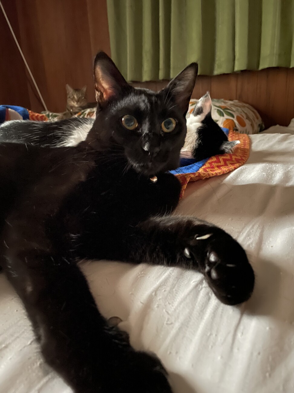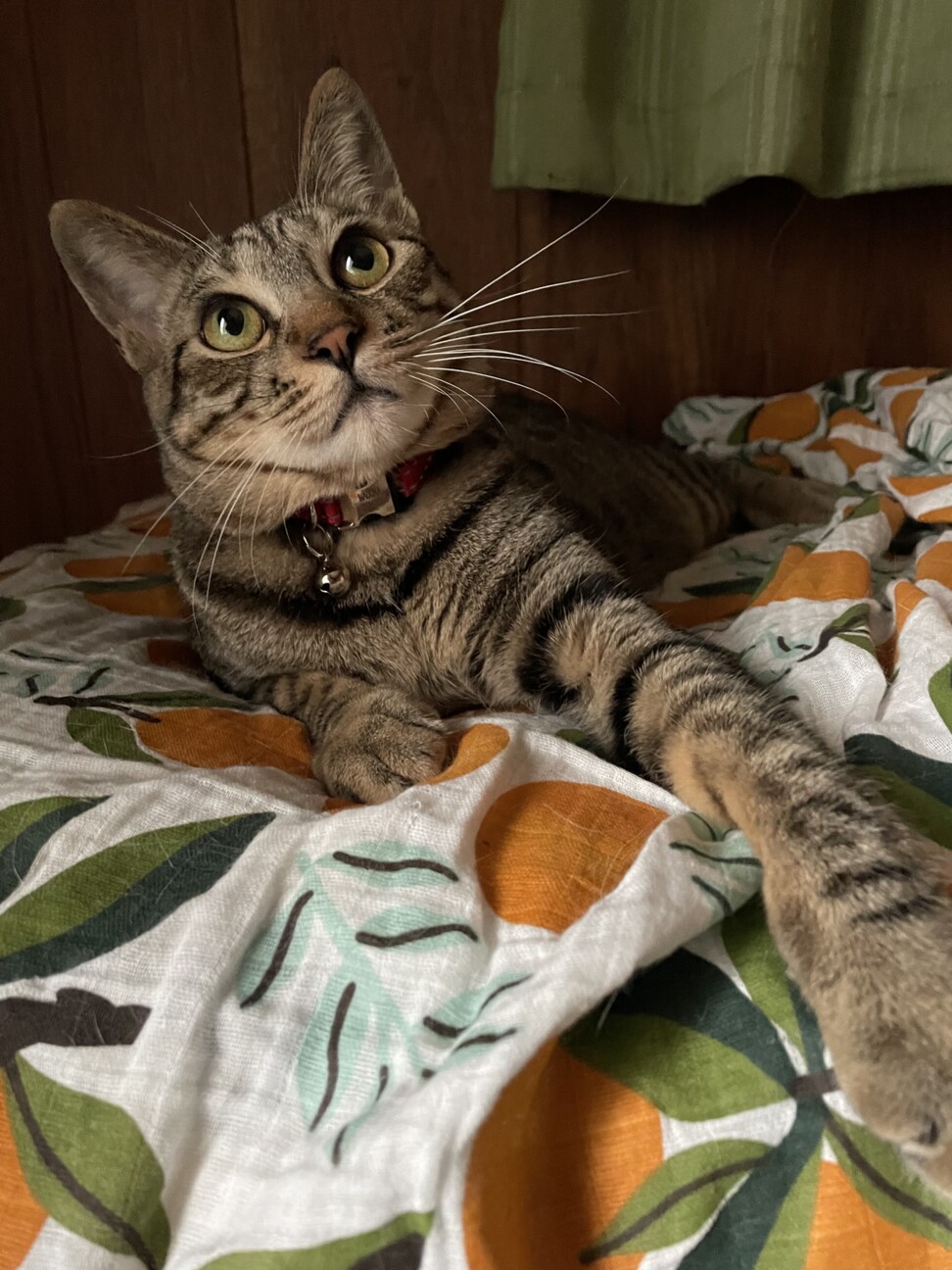 航太朗、まどかとは正反対で野生的で怖がり。昼間はどこかに隠れて過ごし夜になったら出てくるというスタイルが落ち着くのか、猫らしく、そして頭のいい藤丸。だけどある時から母ちゃん達に甘えてくる様になり、この頃は夜は母ちゃんのベッドでお話しながら寝たり、本当はそういうの辛い時もあっただろうに頑張って私達に心を開いてくれました。仲良しの鉄兄ちゃんと気が合う様で2人で遊ぶ姿もよく観ます。これからも藤丸にとって無理のないペースで楽しく生活して行きましょう。