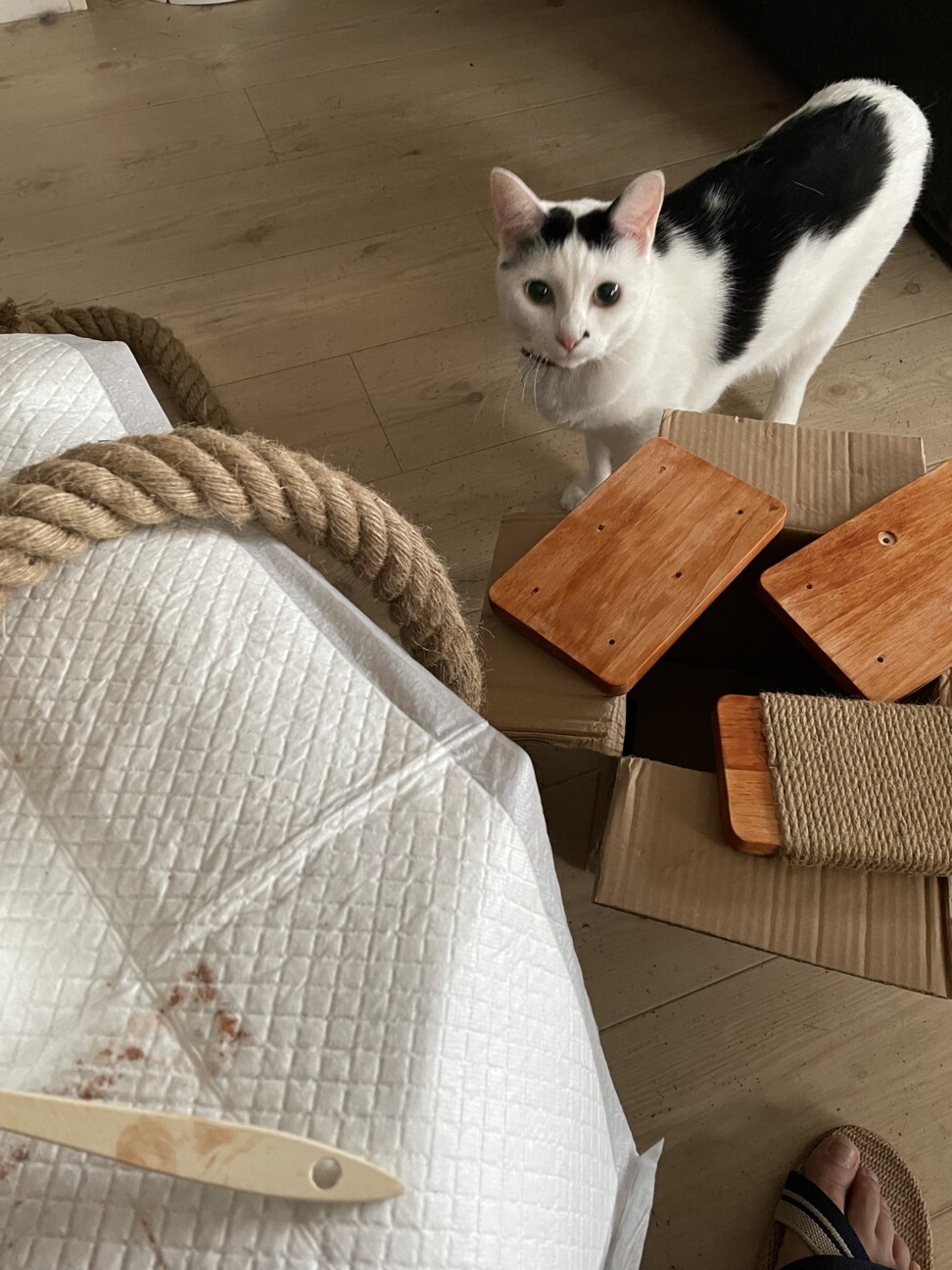 体の大きなコウちゃんが登る事を想定したら、届いたままの状態では荷重問題で多分無理なので、後で補強パーツを追加する事になります。