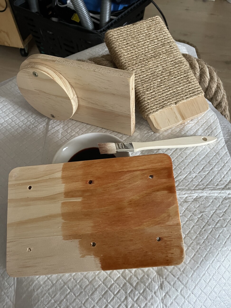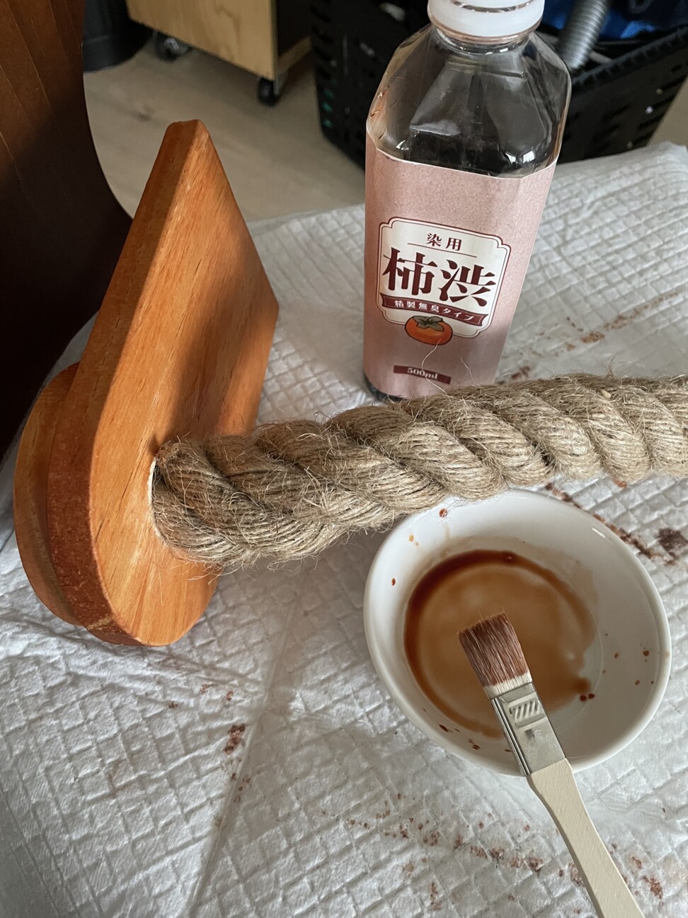 取り付ける前に我が家の定番塗料の柿渋で茶色く染めます。最初は赤茶色だけど空気に触れたら日に日に焦茶になって行きます。