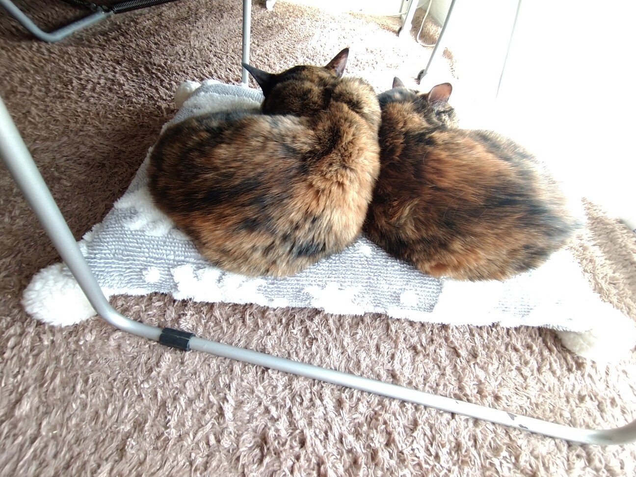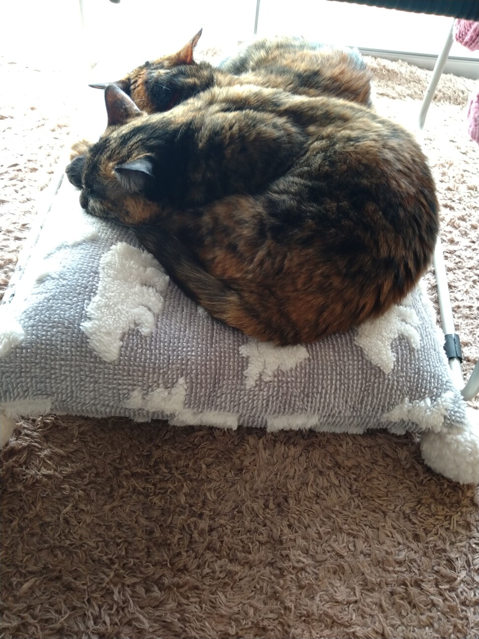 しばらく前に、ホームセンターのペット用品売り場でとっても可愛い猫用座布団を見て、即買い(汗 うちのサビちゃんたちは手作りキャットタワーや、猫棚や、ベッドの布団の上でいつも寝ていて、もうフワフワの寝床はいらないよね、って思っていたけど、ついつい・・・(親バカならぬ飼い主バカです汗) 2ニャンで寝てくれたらいいな、可愛いな って思ってたら、今日2ニャンで寝てくれてた (´∀`*) 可愛いな~ 嬉しいな~ ^O^