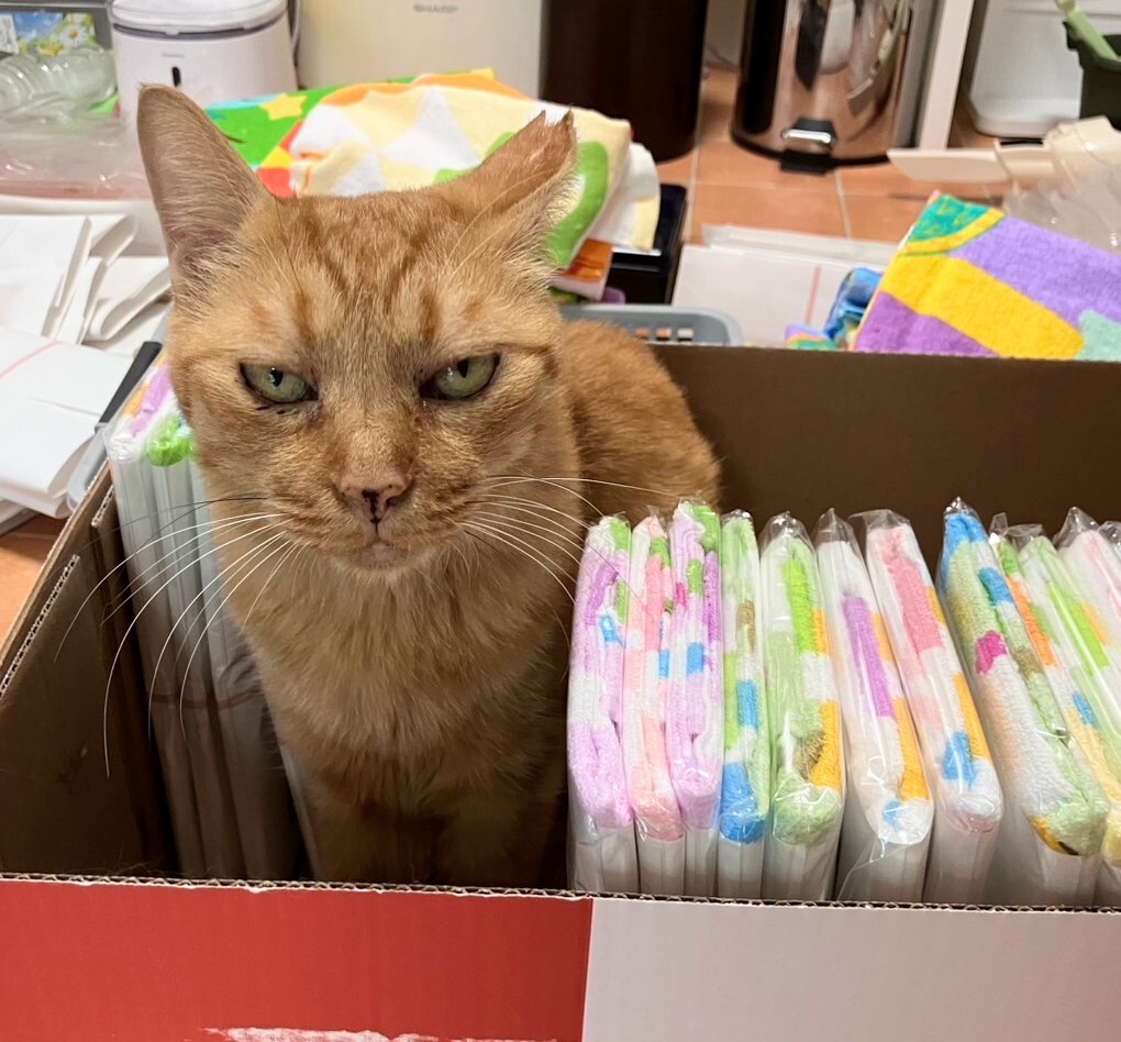お掃除用にタオルをたくさんいただいて、使いやすい大きさにカット中。お千代坊はお邪魔中。