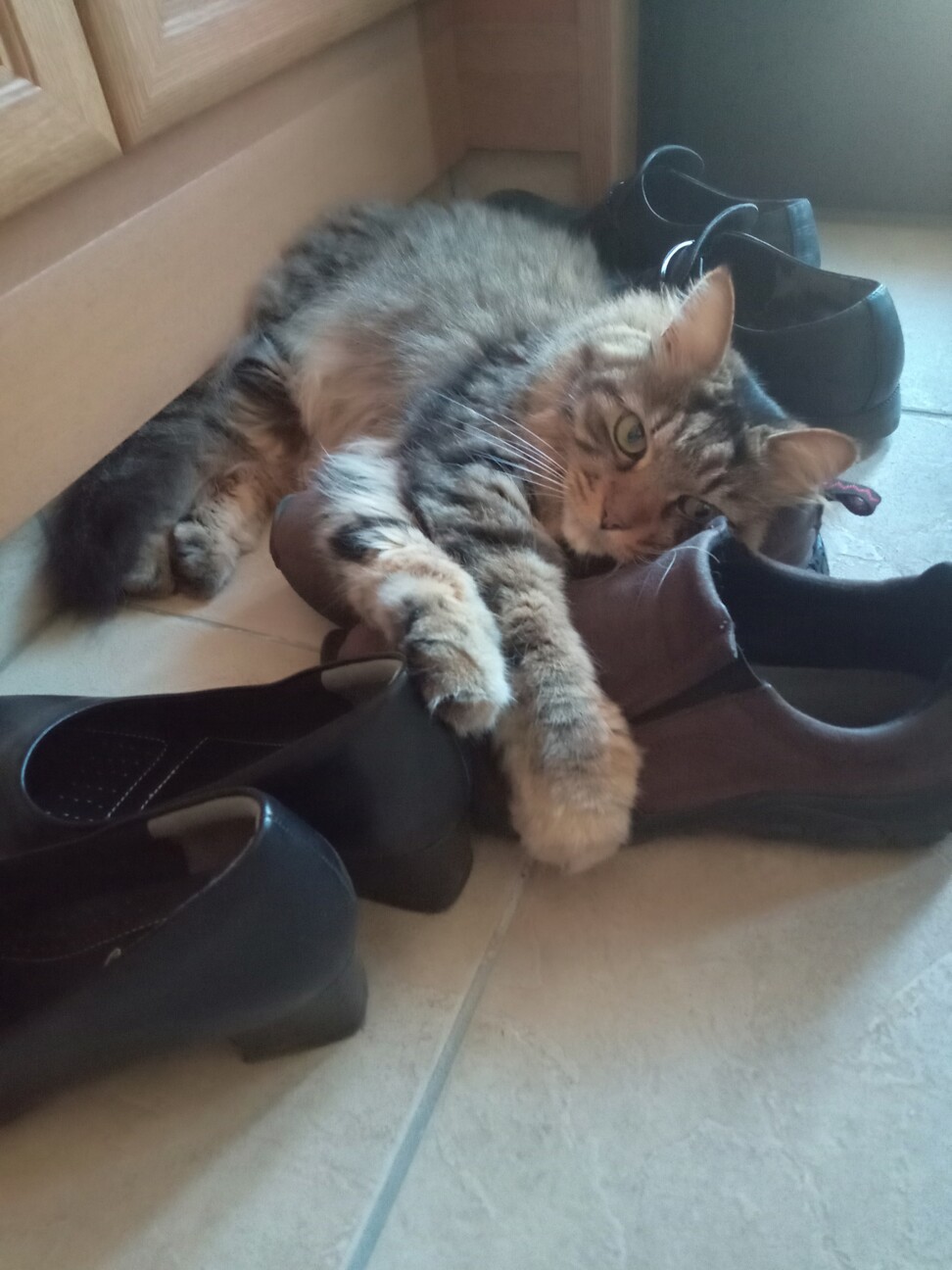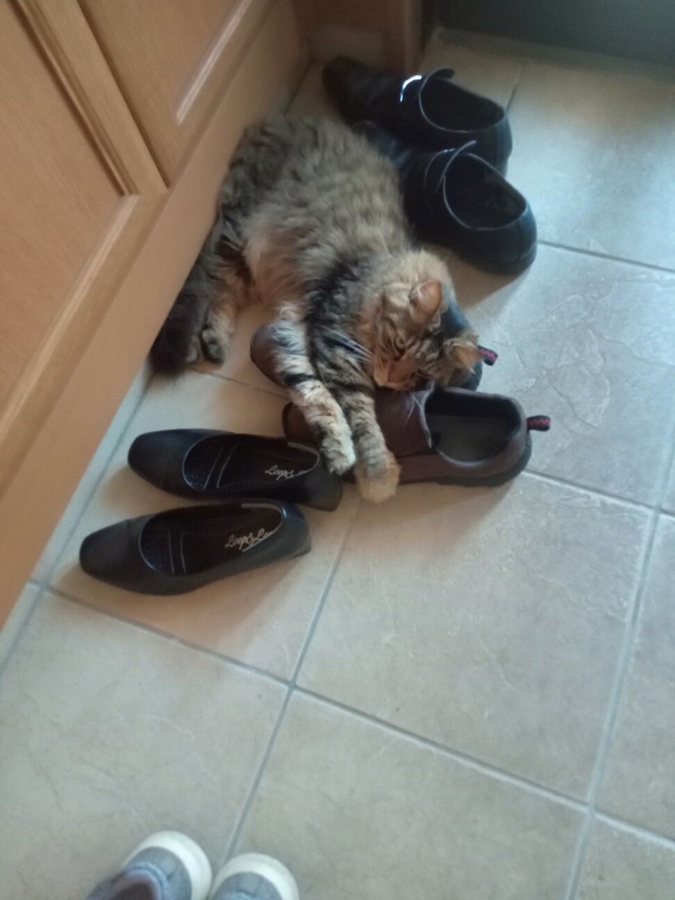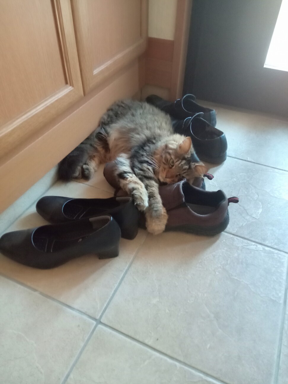 最近、玄関に降りて靴にグリグリ臭いを付けて、ゴロンと寝ることが多いです!不衛生なので辞めさせますが、困ったもんです。(-_-;)犬は靴が好きですが、猫も好きなのかな?以前から、スリッパを枕にしてたから臭いは靴と変わらないですね!