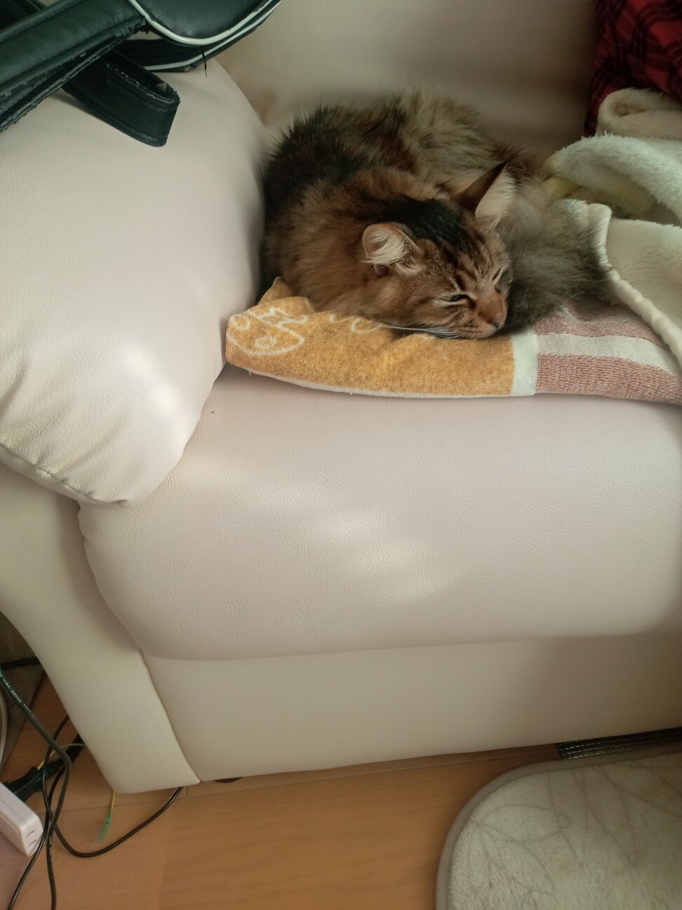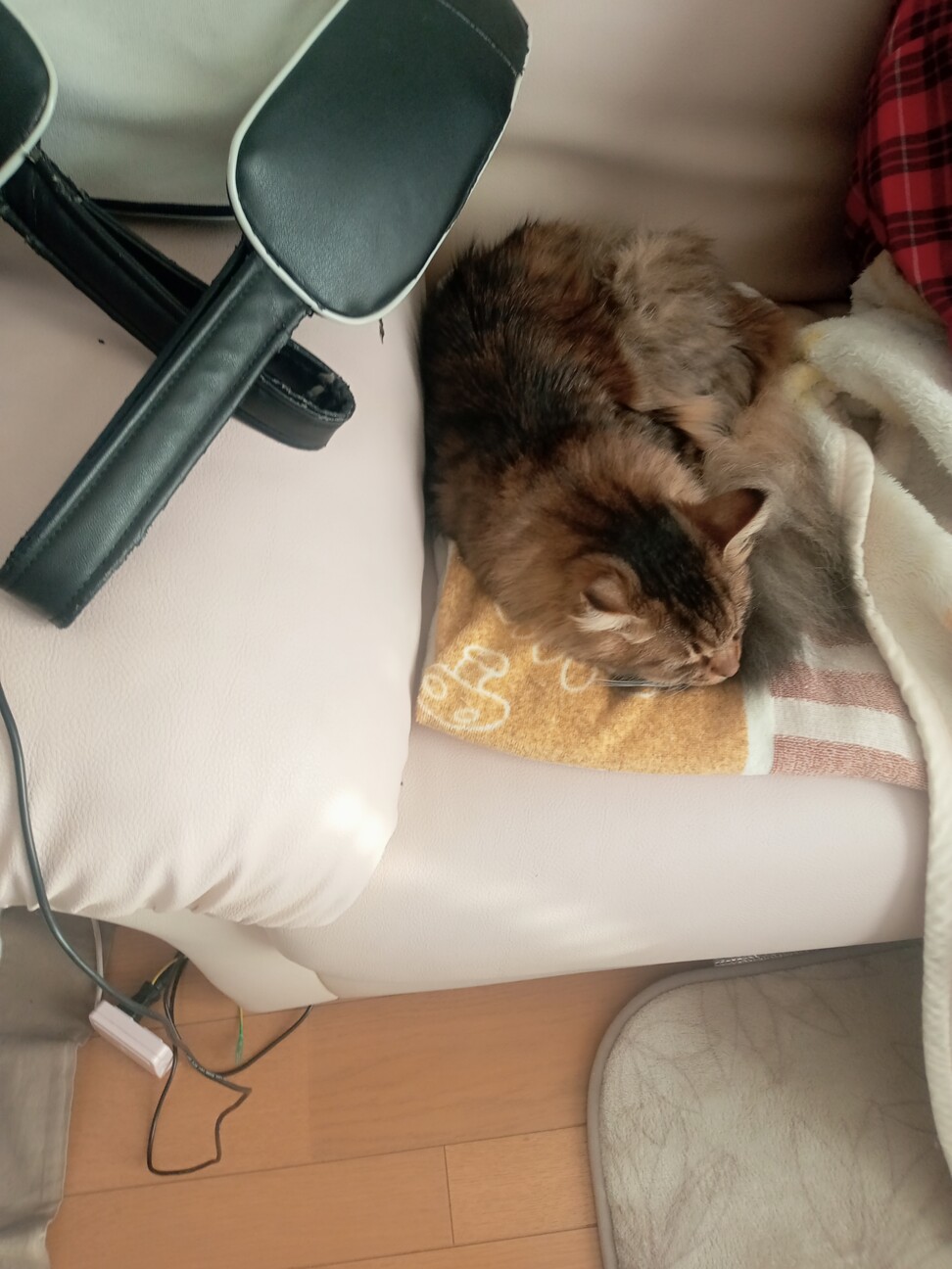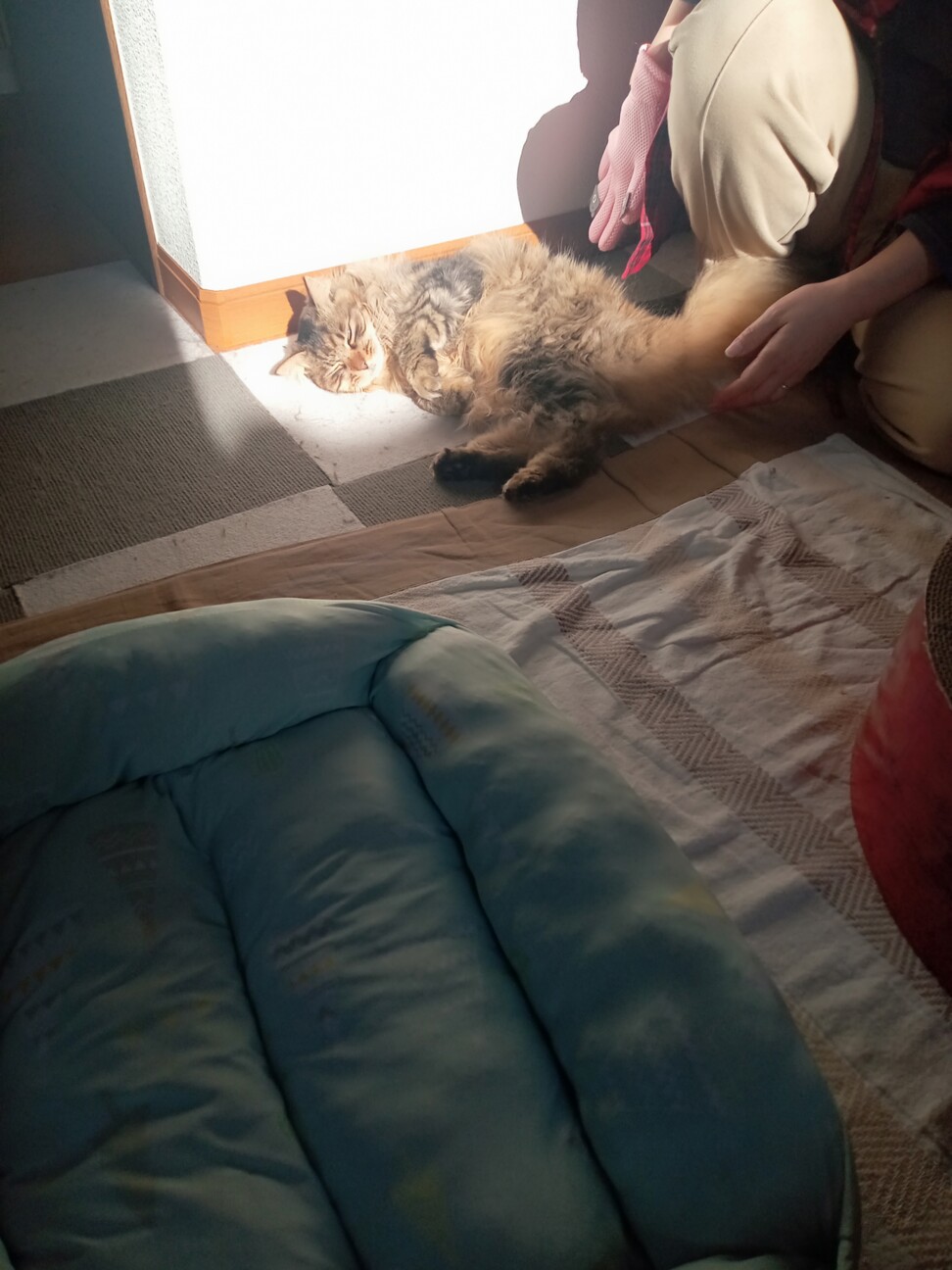 日の出が少しずつ早くなってきましたが、リビンクに日差しが入るとルシ君のグルーミンググローブの時間です!おけけやる?とルシ君に聞くと、嬉しそうにお返事します(^o^)朝から膝抱っこのおねだりしてますが、この日は珍しく妻の隣で寝てました。