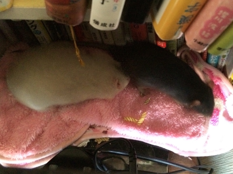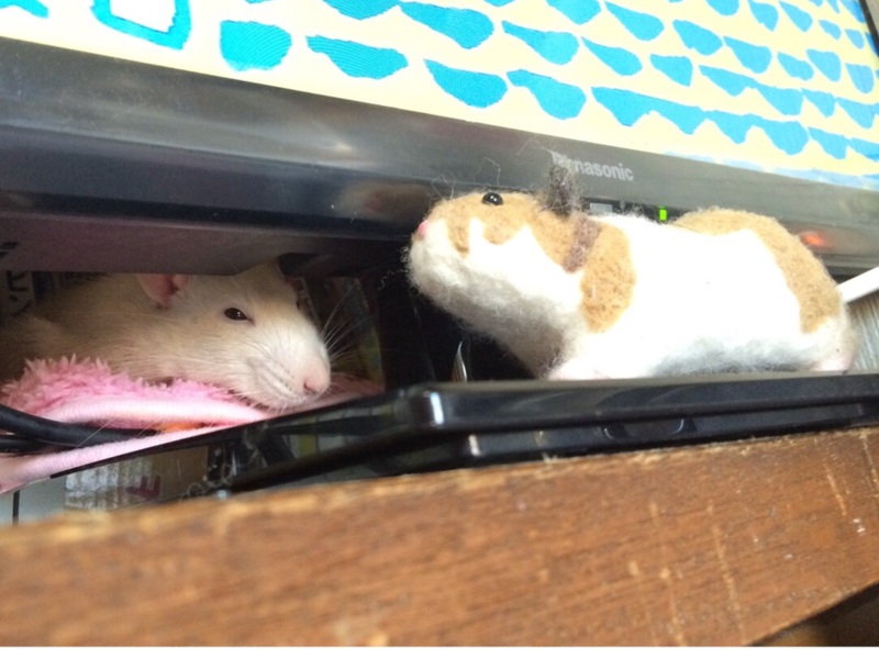 ノンビリ・マッタリ自由な時間を過ごす佐藤さん。 まだ少し暗い明け方、マカロニを齧る音が寝床から聞こえていました。 南瓜、サツマイモ、人参、ハムフード…などをお皿に入れて与えると、咥えられるだけくわえ、寝床に運んで蓄え&お食事。 その後はテレビの間からこちらを見ながらマッタリと寛いでいました(写真1)。 その後、娘がシロを連れてきて、佐藤さんの所へ…。 シロは若いので、チョロチョロ。佐藤さんの入り込まない所にも入り込んで探検してました。(写真2、写真3)