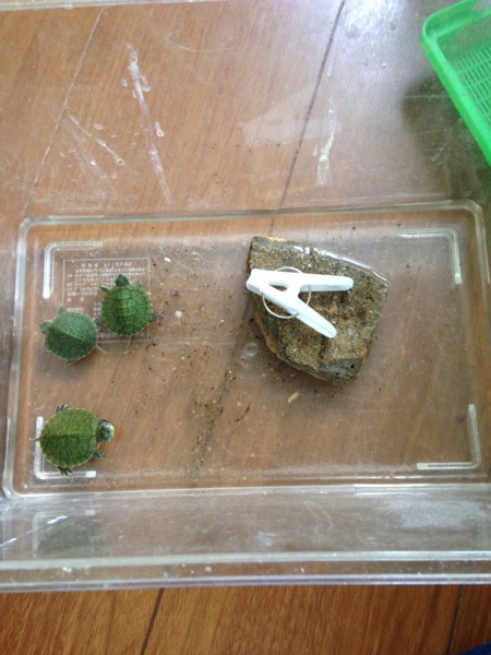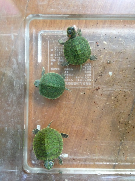 うちには3匹のミドリガメがいます。一番大きいのは♀で8年目、あとの2匹は♂で6年目、7年目です。すべて子ども達が祭りで掬ってきました(^^)