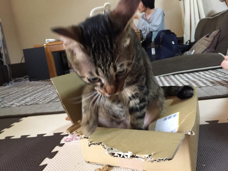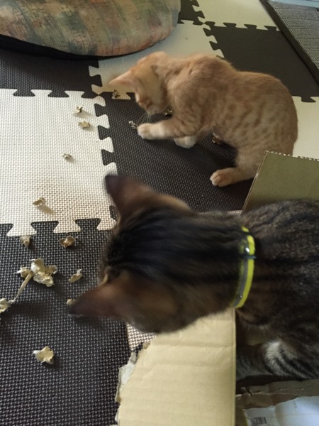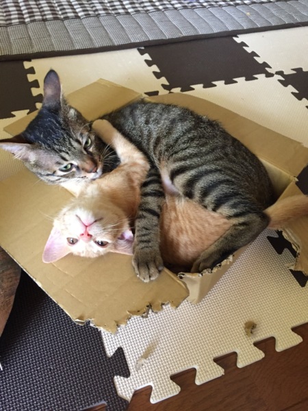 最近、こたつがダンボールをかじります。 もう、歯は生え変わってるので痒みが原因ではないので、もしかしてストレス⁇ つくしの教育係に疲れて来たのかな? 昨日はツメ研ぎを入れていたダンボールをボロボロに…(^_^;) 何も知らないつくしは、こたつがボロボロにしたダンボールの端切れで横で遊んでました( ´艸`)ムププ そして数分後…。 そのダンボールに2匹が無理無理入って抱き合ってました(笑) 結局、仲いいじゃん‼︎(笑)
