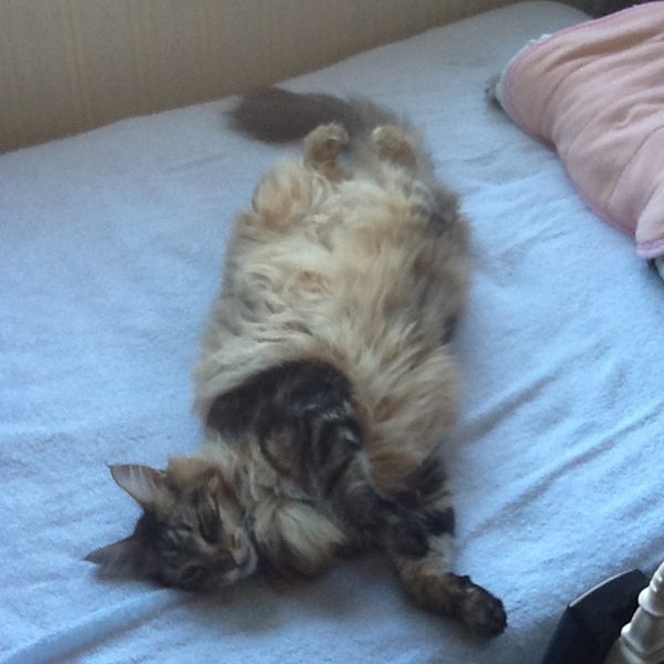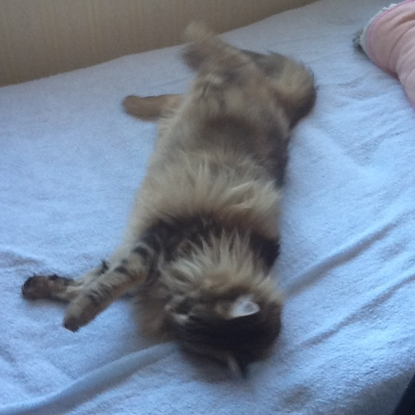 人間を差し置いてけしからんことに新しくしたシーツで最初に寝たのはベルクさんでした。何か口をたまに動かし、尻尾の先をブルブル痙攣させるのは絶対に夢を見ているに違いないと思いますが、たぶん食べ物の夢でも見ているのでしょう。美味しい佐藤錦でもたらふく食べている夢でも見ているのかな?(笑)