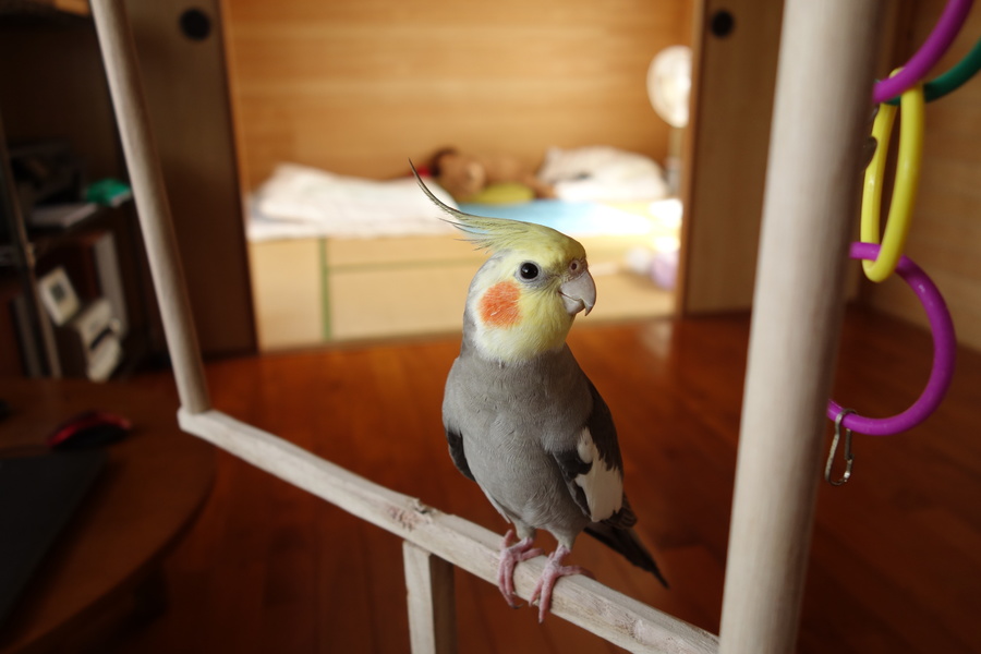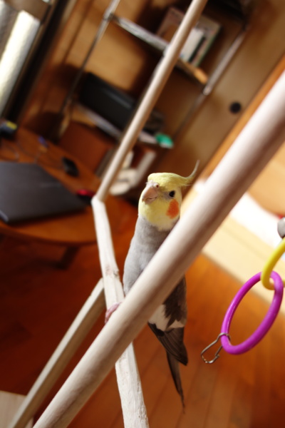ポール君へ旦那様から手作りの止まり木のプレゼント。