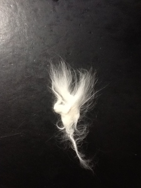 そして謎のケサランパサランですが、本日ついにうにちゃんの体に付いた状態で発見してしまいました。そしてそれは前回のより大きいのですが、どこにあったかというと、それは首輪の下に出来た毛玉でした。