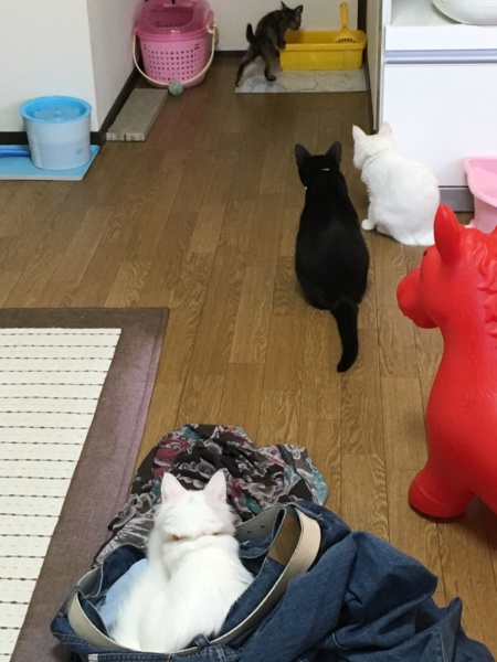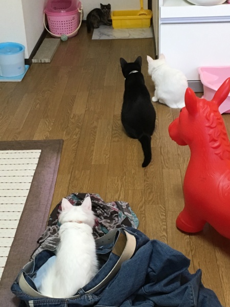 猫軍団がキキちゃんをガン見…( ^ᴗ^; ) 確実に狙われています(ू˃̣̣̣̣̣̣︿˂̣̣̣̣̣̣ ू) 3人とも身動ぎせず、キキちゃんをガン見。 キキちゃん焦って挙動不審(๑ ᷄⌓ ᷅๑) 長男が迎えに行って抱き上げて事無きを得ましたが、怖い(๑ ᷄⌓ ᷅๑) 目が離せないです。 特にジジちゃんが危険すぎる…( ^ᴗ^; )( ^ᴗ^; )( ^ᴗ^; ) レオ君はもちろん、興味なし。 長男の椅子の足元にいました。