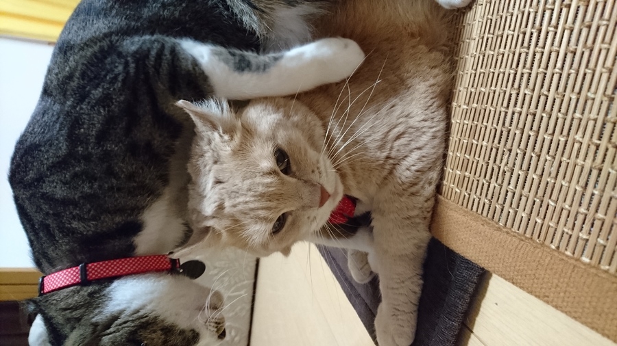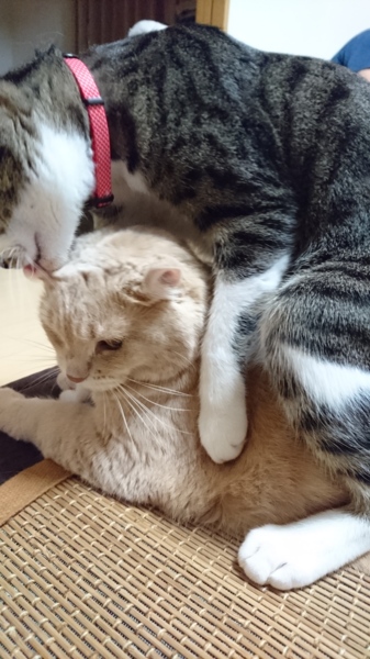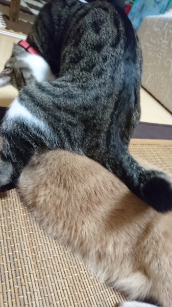 ジェリー図々しくもなんとか頭に座ります。毛繕いしてんのよ~的な感じでさりげなくバージョンを狙ったようですが、さりげないわけもなく。この後それはそれは荒れました。