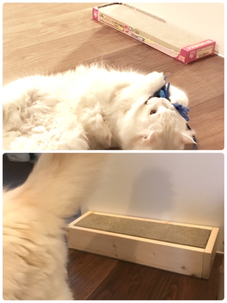 うーにゃんへの爪研ぎはケージ生活のみはこれで対応と簡易に作ったものなので見た目は。。。汗