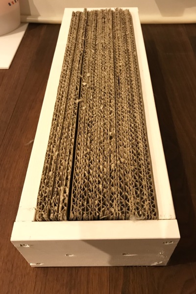 ちなみに最初は市販の爪研ぎの中身だけ入れていましたが、今はうーにゃんの簡易爪研ぎと同じく廃材のダンボールを切って入れてます。