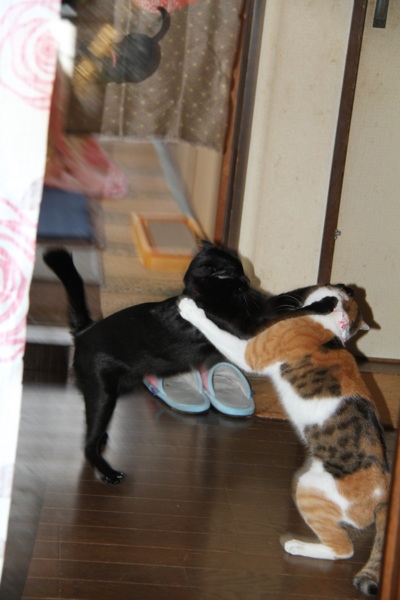 メスの大人がメスの子どもと相性がいいというのは我が家では当てはまらなくて、ほぼ一年かかってようやく慣らして一緒に遊ぶようになりましたが、やはり自分のテリトリーに入ってくることは、どうにも嫌なようです。