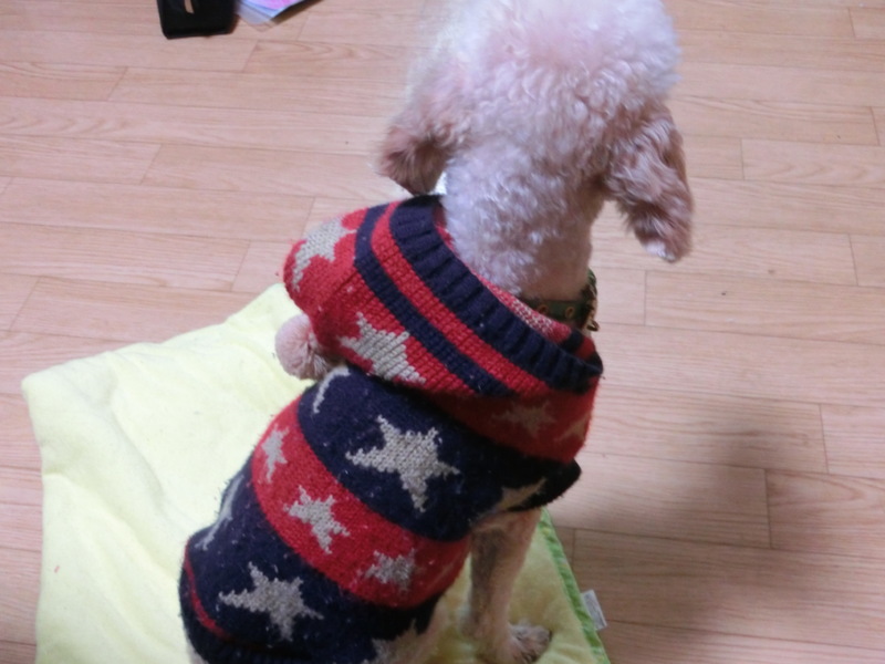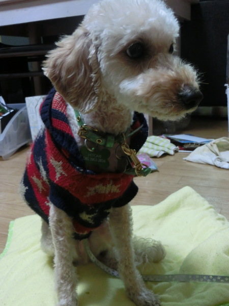 トリミングをして、初(?)のサマーカット。この時期に申し訳ないね、ファル。でも、毛がモコモコで実際の大きさもわからず、体型も確認できず、皮膚の状態も確認したかったので、しっぽをライオンカットにしてもらい、この寒い時期に3mmのサマーカット。風邪ひきませんように。3kgのラビが着ていたセーターを6kgのファルに試着させたところ、ぴったり!でも長さが短いなー。ぶるぶる震えなくなったので暖かいのだろう。よかった。恐らく初めて洋服を着るのに、抵抗もせず大人しいのはプードルだから??寒すぎたから?(笑)噛まれずに服を着せられたので、一安心でした。