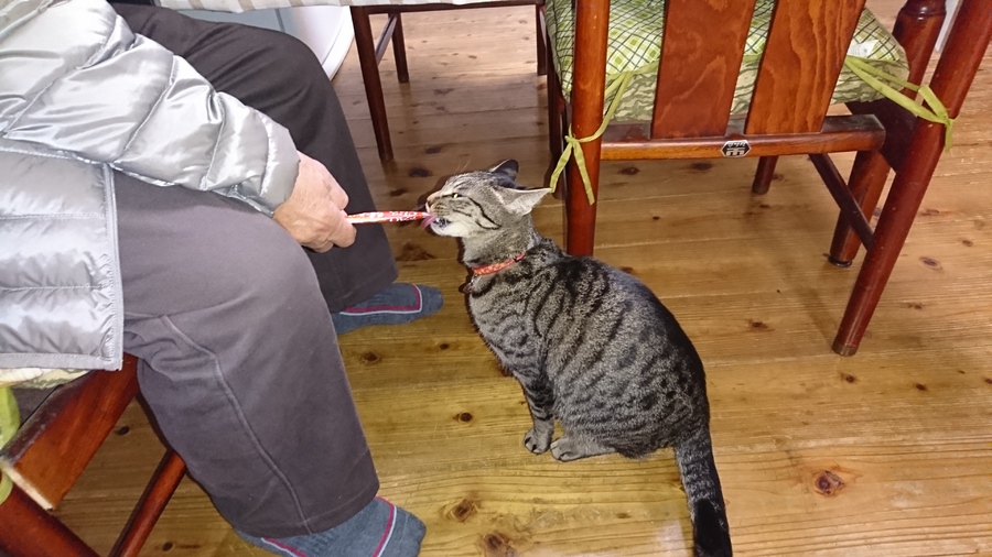 写真2は、おやつ(ちゅ~る)担当の父親に舐めさせてもらってる雅(みやび)。