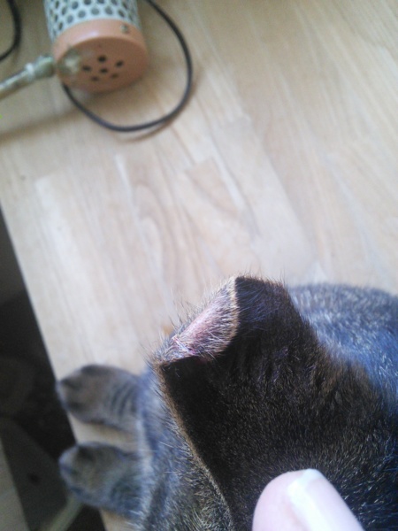 耳の先が切れて血が固まって反対側にそっくりかえっちゃってる。