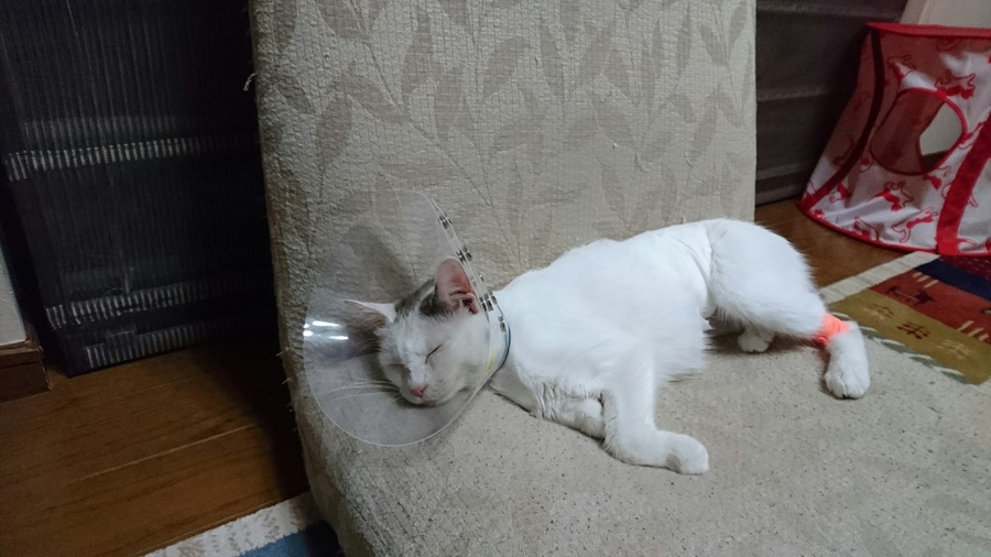 傷口を舐めないように、エリザベスカラーとかいう、ヘンテコなものをつけて、