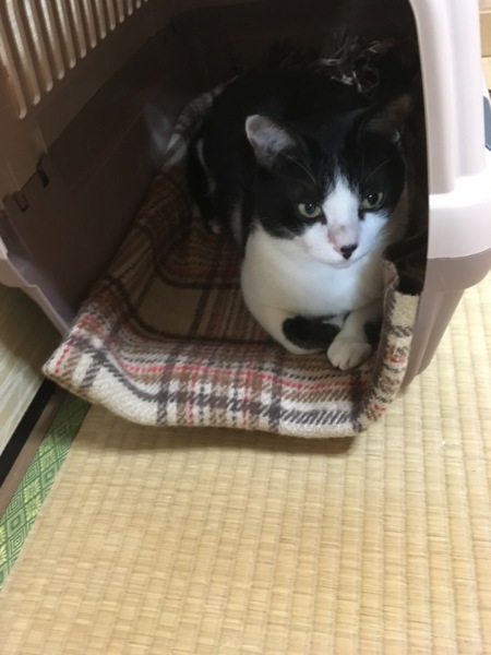 最初はエリザベスカラー(透き通った素材のものをネットで購入)を付けて半日様子を見ていたのですけど、ご飯も食べなくなり水も飲もうとしなかった上、私の布団に入ってきて中でぐるぐると回り始めたので、これはそのままだと病気になりそうなのでカラーは断念しました。
