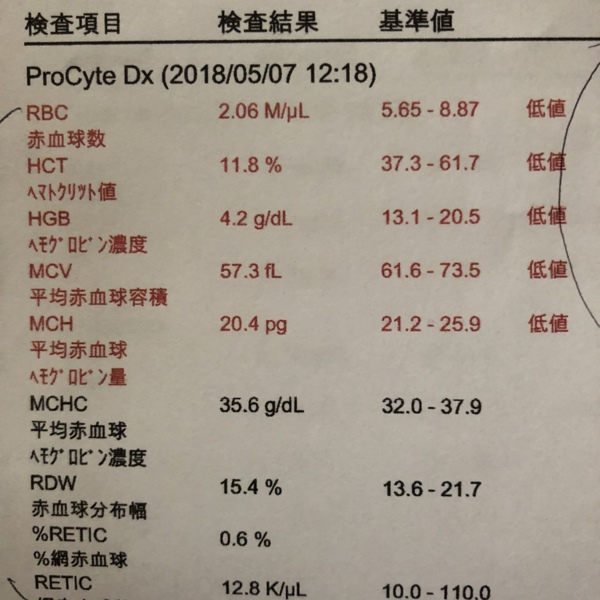 通常ならショック死してもおかしくないレベルの貧血です。