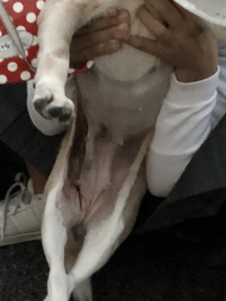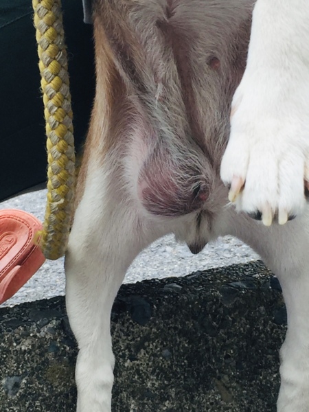 2枚目:2年前、たまごほどの膨らみを診てもらいに動物病院に行った時。診断は脱腸でした。当時10歳、心臓も弱いとの事でこのまま様子見ましょうとの事で放置。