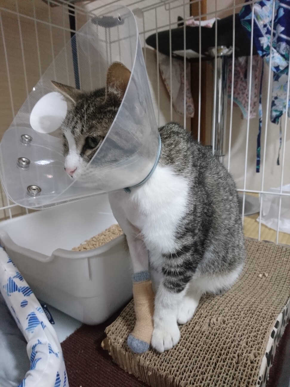 自宅では基本的にケージ内安静、リハビリ、テーピングによる固定を行っています。
