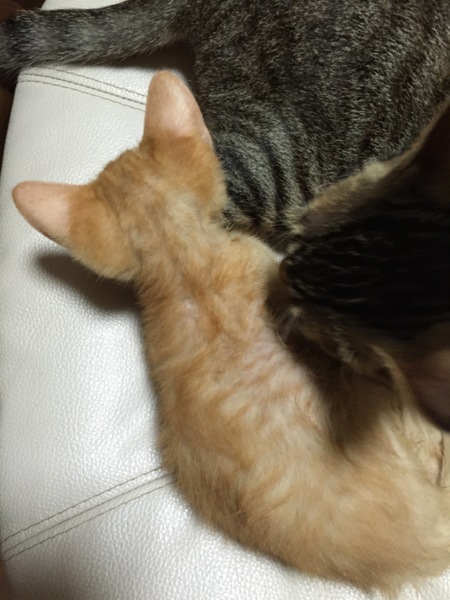 多分、ハゲはこたつに咥えられて出来たもの。薄毛は子猫の時期ならよくある事。だそうです(#^.^#)