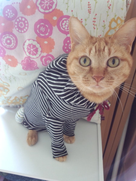 避妊手術を受けた後、お腹の傷が気になりどーしてもお腹を舐めすぎるように… 舐めまくった結果皮膚が炎症を起こしてしまうので、エリザベスカラーや洋服などを駆使して奮闘中です! 宮古島在住なので猫用のお洋服はなかなか見ません。ならば作っちゃおう!と何とか形にしてきましたが…洋服の上から舐めすぎてすぐに服破れる(。´Д⊂) それでもめげない飼い主に、不満げな顔を向けてきます。そんなスズさんにいつか分かってもらえる日が来ると信じて頑張ります★